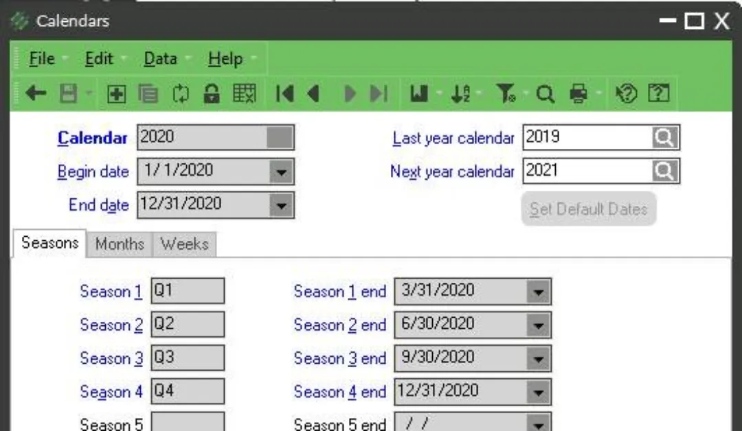 First, create a calendar (if you don’t already have one) for 2020 in Setup | System | Calendars. You can configure custom Seasons, Months, and Weeks, or you can click the Set Default Dates button to accept the defaults: